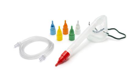 Ein komplettes Set mit 5 Venturi-Ventilen, Eco-Aerosolmaske für Erwachsene, Sauerstoffschlauch und Befeuchterbecher. Der Flow, der auf den Ventilen angegeben ist, stellt sicher, dass der Patient einen Total-Flow von ca. 40 L/min erhält. So werden die normalen Peak-Flow-Bedürfnisse des Patienten erfüllt.
